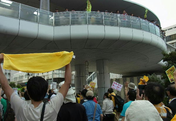 連絡橋の通行人に脱原発と「野田ノー」を訴えた