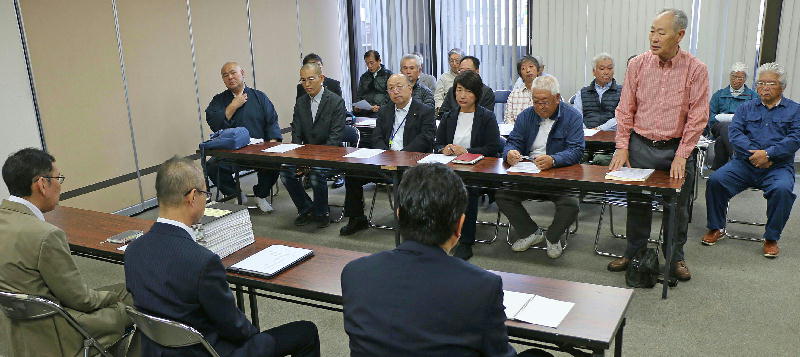 県(手前)に求める地元の住民と農業者。立って発言しているのは佐々木悠二さん。